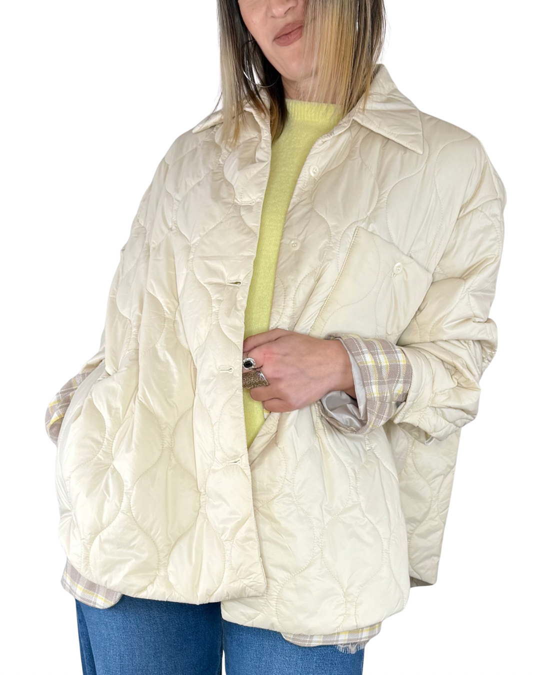 Questa giacca trapuntata over è il capo essenziale per la transizione stagionale: la silhouette generosa consente layering sofisticato e look versatili che si adattano perfettamente dal tardo inverno alla primavera. Un pezzo che trasforma il tuo guardaroba con eleganza senza sforzo.