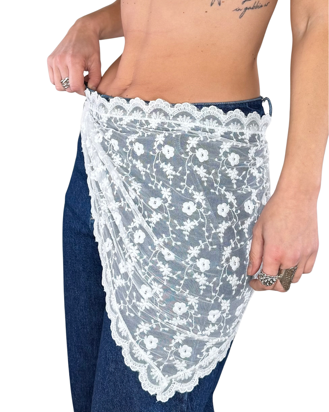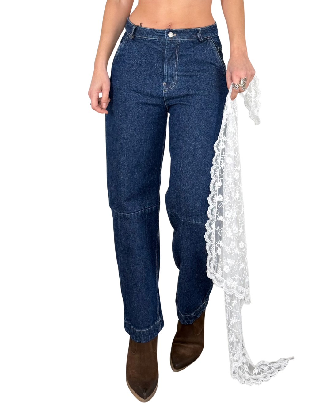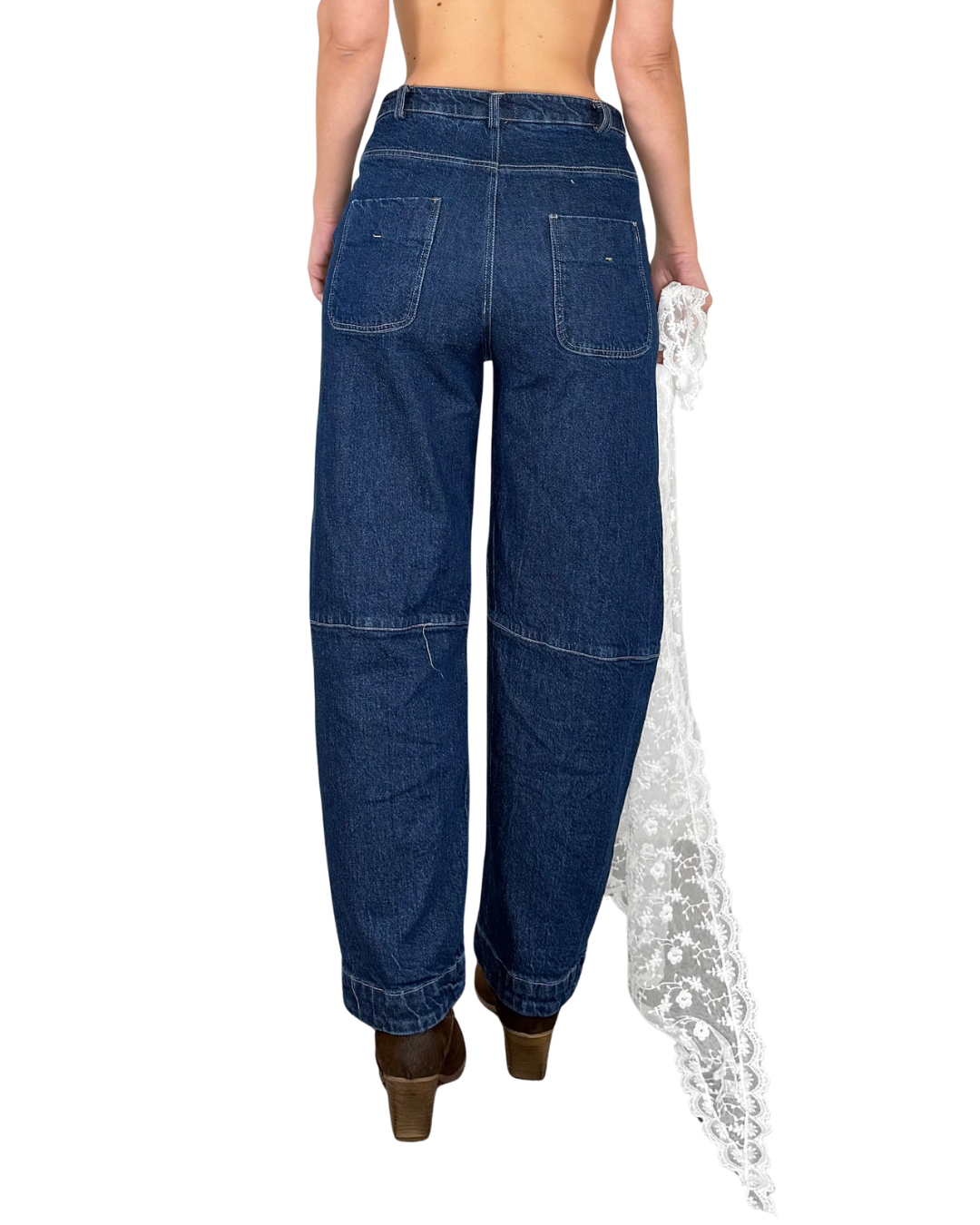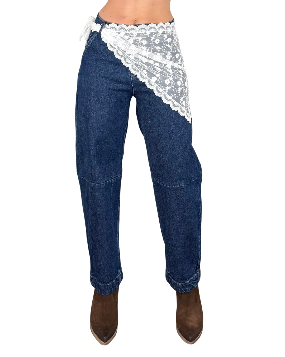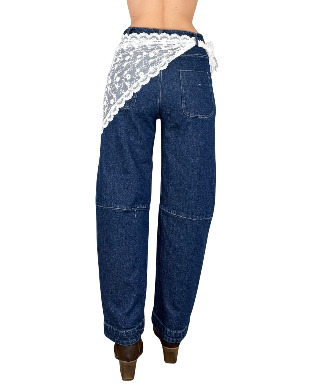 È il pezzo che completa ogni guardaroba: silhouette barrel contemporanea in lavaggio scuro non trattato, impreziosito da cuciture bianche a contrasto che catturano la luce. La bandana in pizzo bianco raffinato è removibile, permettendoti di giocare con lo stile—indossala per un'eleganza ricercata o toglila per un'essenzialità moderna. Una vestibilità che valorizza la figura e ti fa sentire sicura e consapevole, dal giorno alla sera senza compromessi