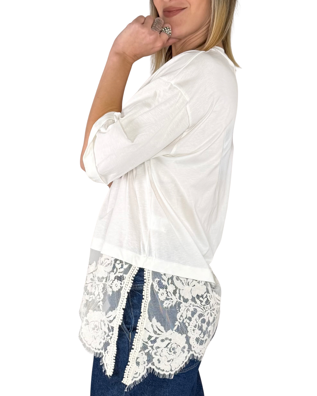 La t-shirt che reinventa il basic: linee pulite con risvolti sulle maniche che catturano l'attenzione, arricchita da un pizzo obliquo elegante e uno spacco strategico sul fondo che aggiunge movimento e sensualità. Un capo che fluttua tra il casual e il sofisticato, perfetto da indossare da solo o stratificato, trasformando ogni outfit in un'affermazione di stile consapevole. Semplice nella forma, straordinaria nell'effetto