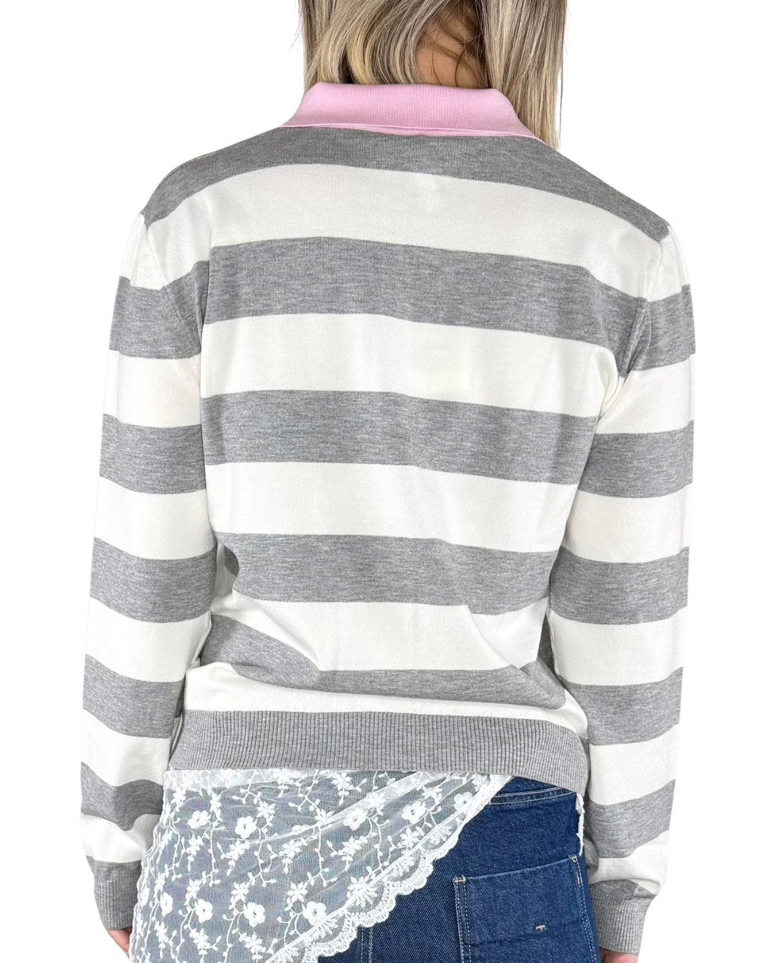 La polo che definisce lo stile per la mzza stagione: filato pregiato con righe larghe che catturano la luce, impreziosito dal colletto a contrasto che aggiunge un tocco di personalità. Perfetta per transizioni di stagione, questa maglia si adatta a ogni momento della tua giornata, dal casual al sofisticato. Un investimento in versatilità e eleganza che non passerà inosservato