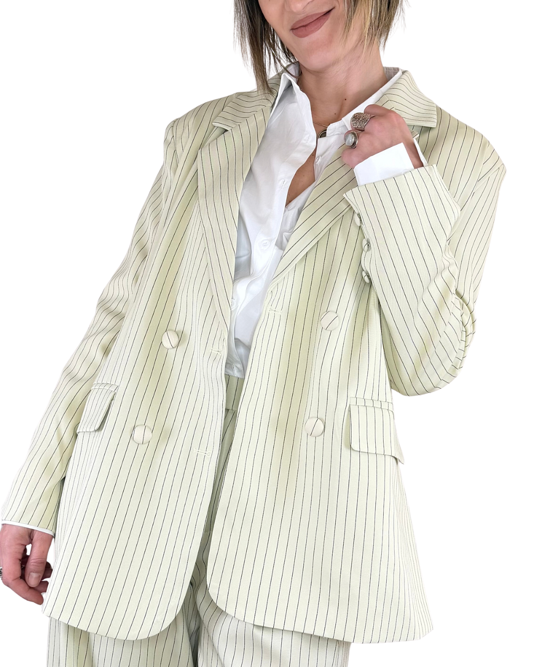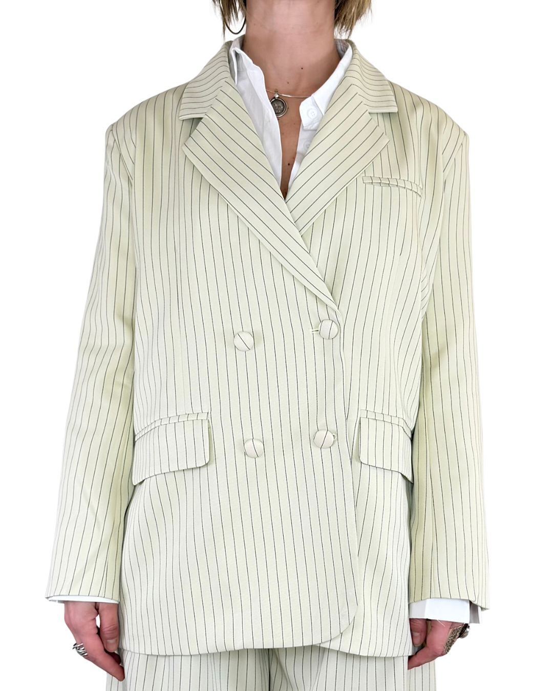 Completo gessato oversize che unisce eleganza e versatilità:
