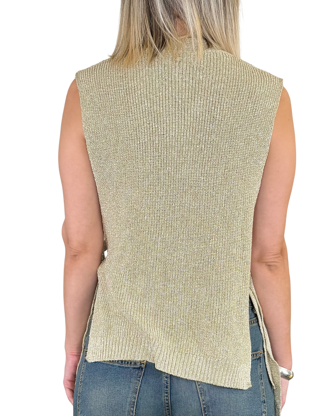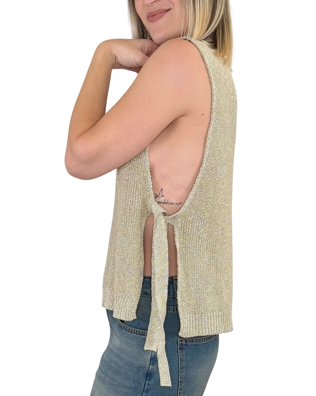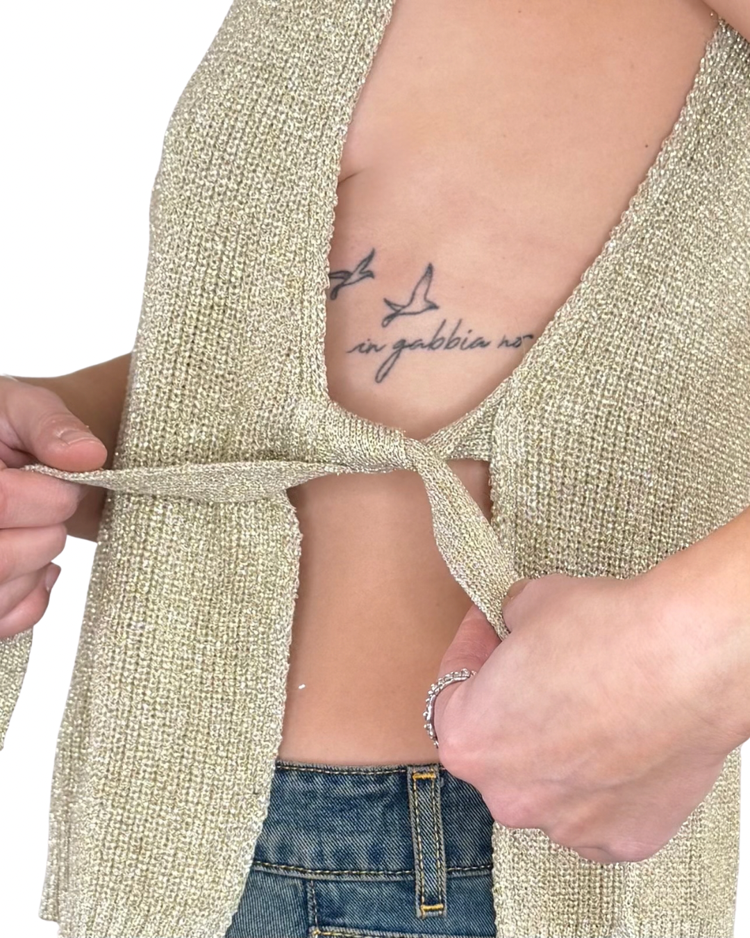Gilet in maglia punto inglese con filo di lurex, apertura laterale e fiocchi per chiudere