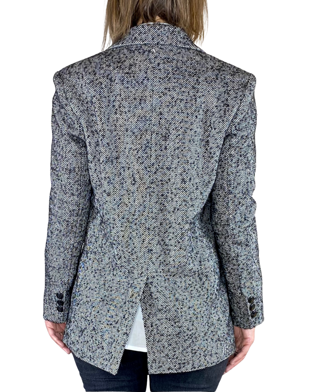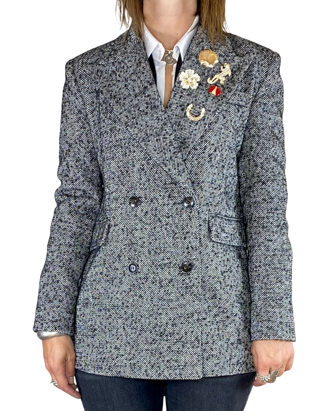 Blazer spinato doppiopetto con spille peso cappotto fodera interna macula
