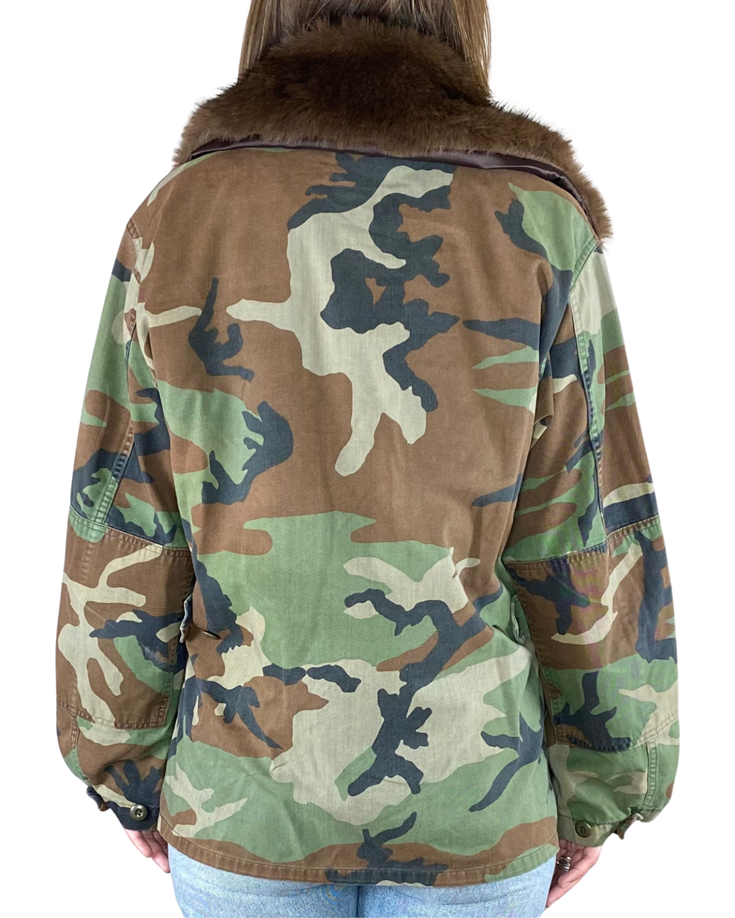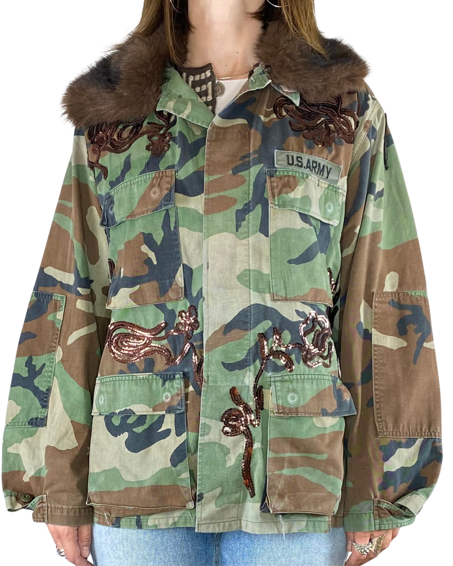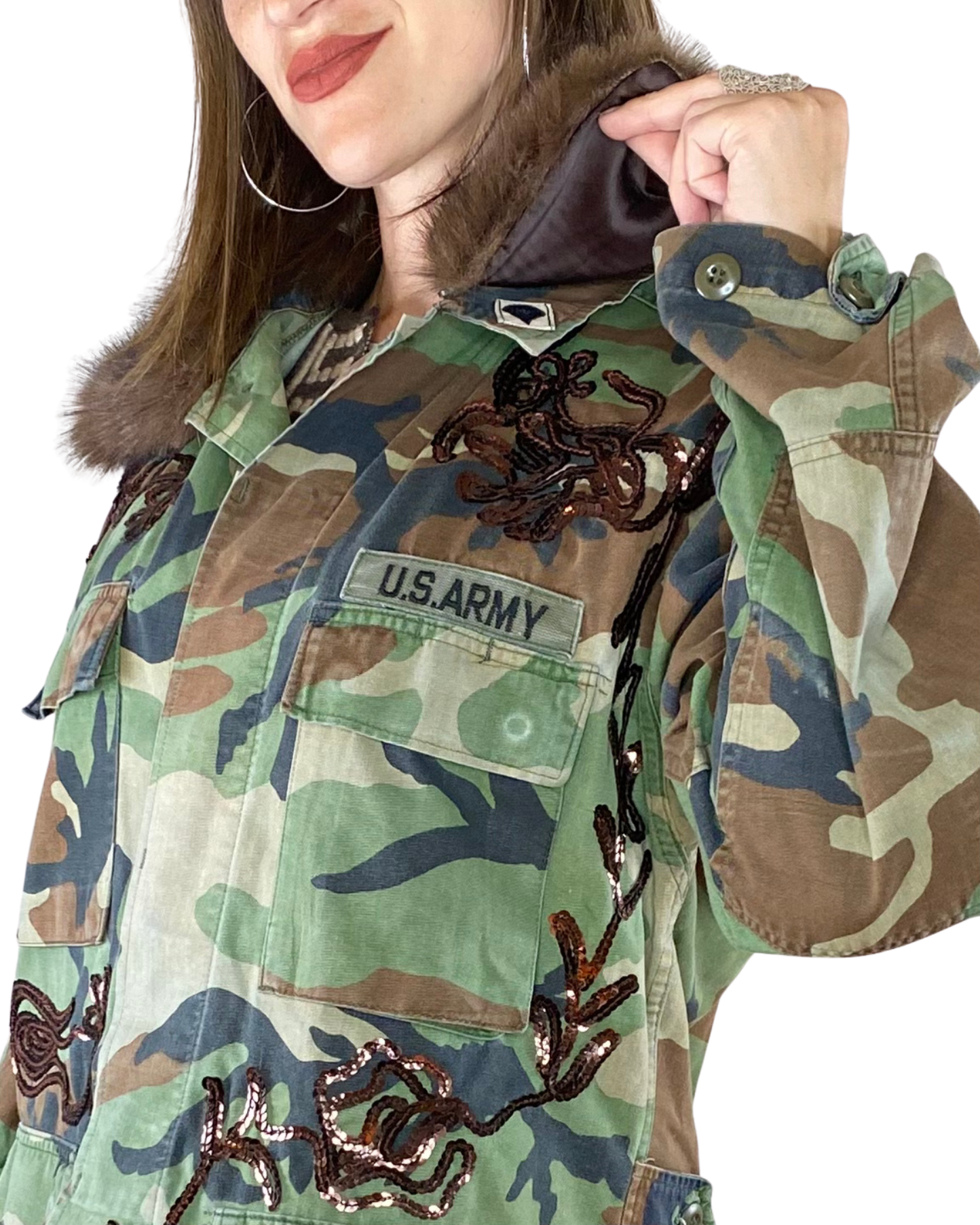 Sahariana americana camouflage collo pelliccia staccabile e paillettes