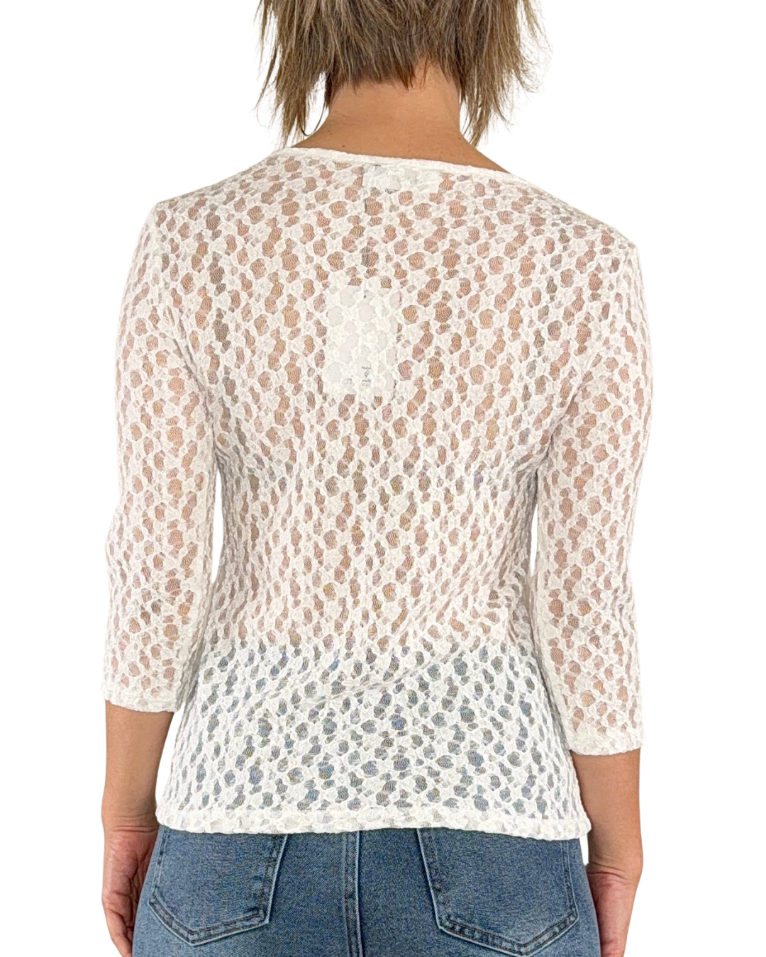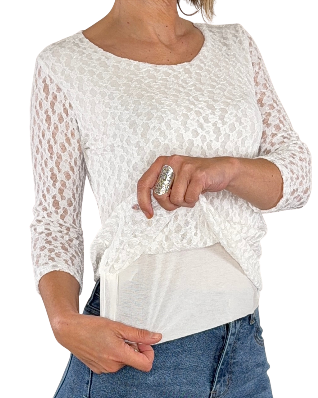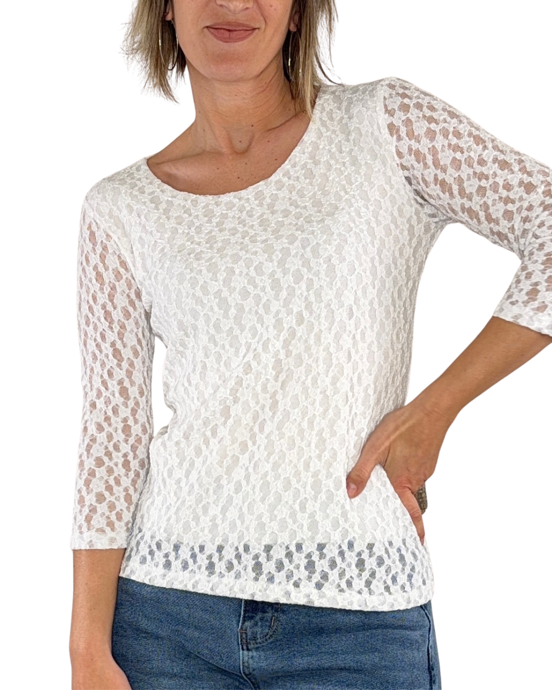 Spitzenshirt mit 3/4-Arm, vorne mit Besatz. Perfekt, um jedem Look Weiblichkeit und Raffinesse zu verleihen.