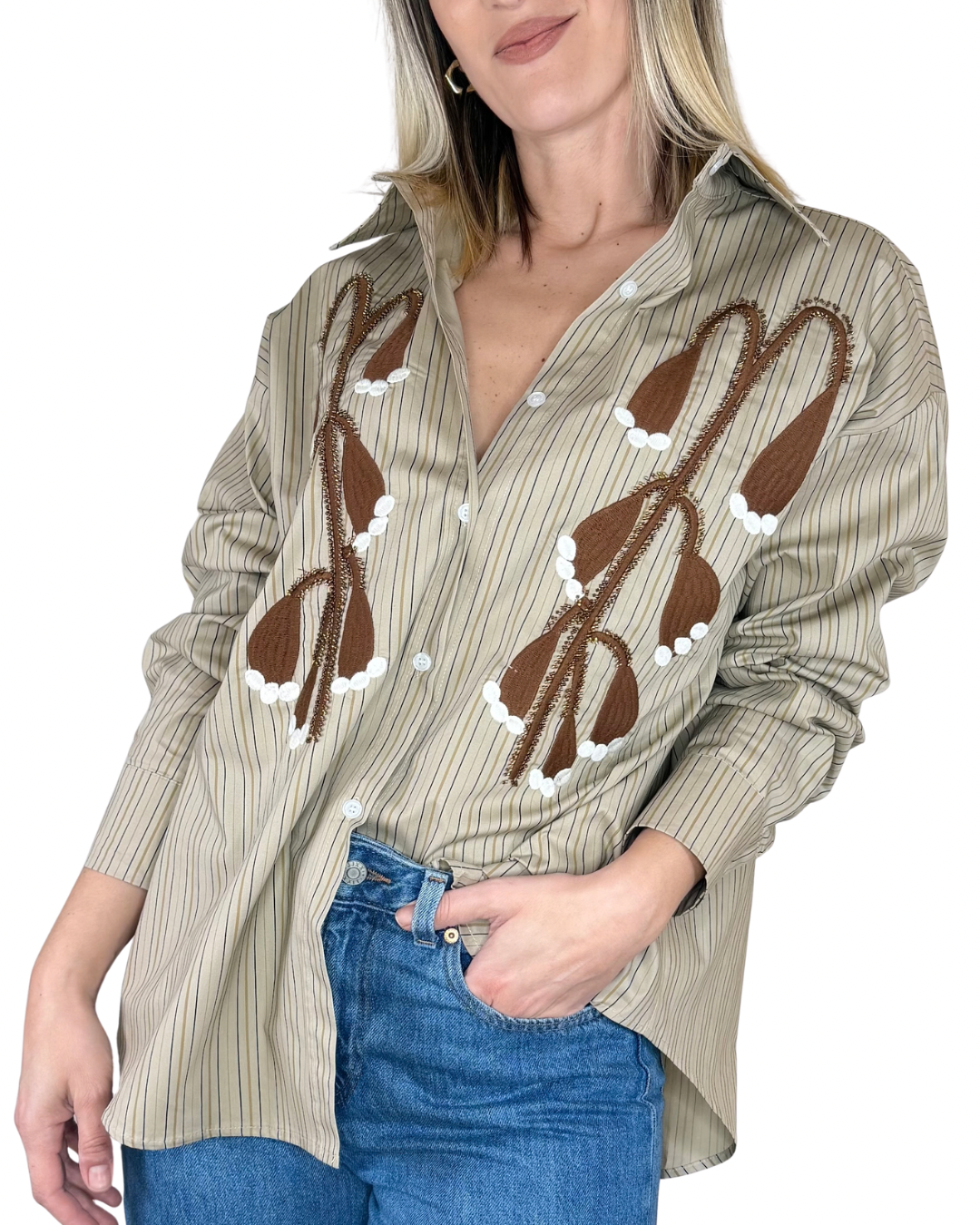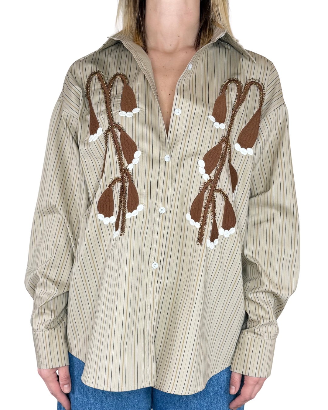 Habiti - Camicia righe ricami artigianali - FANGO
