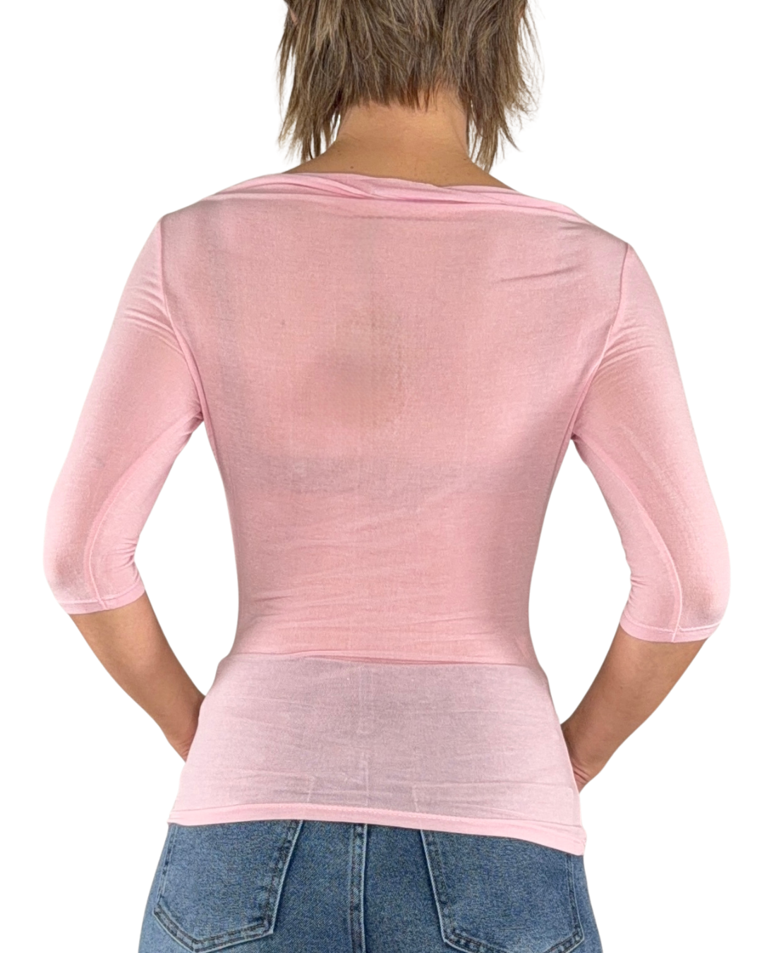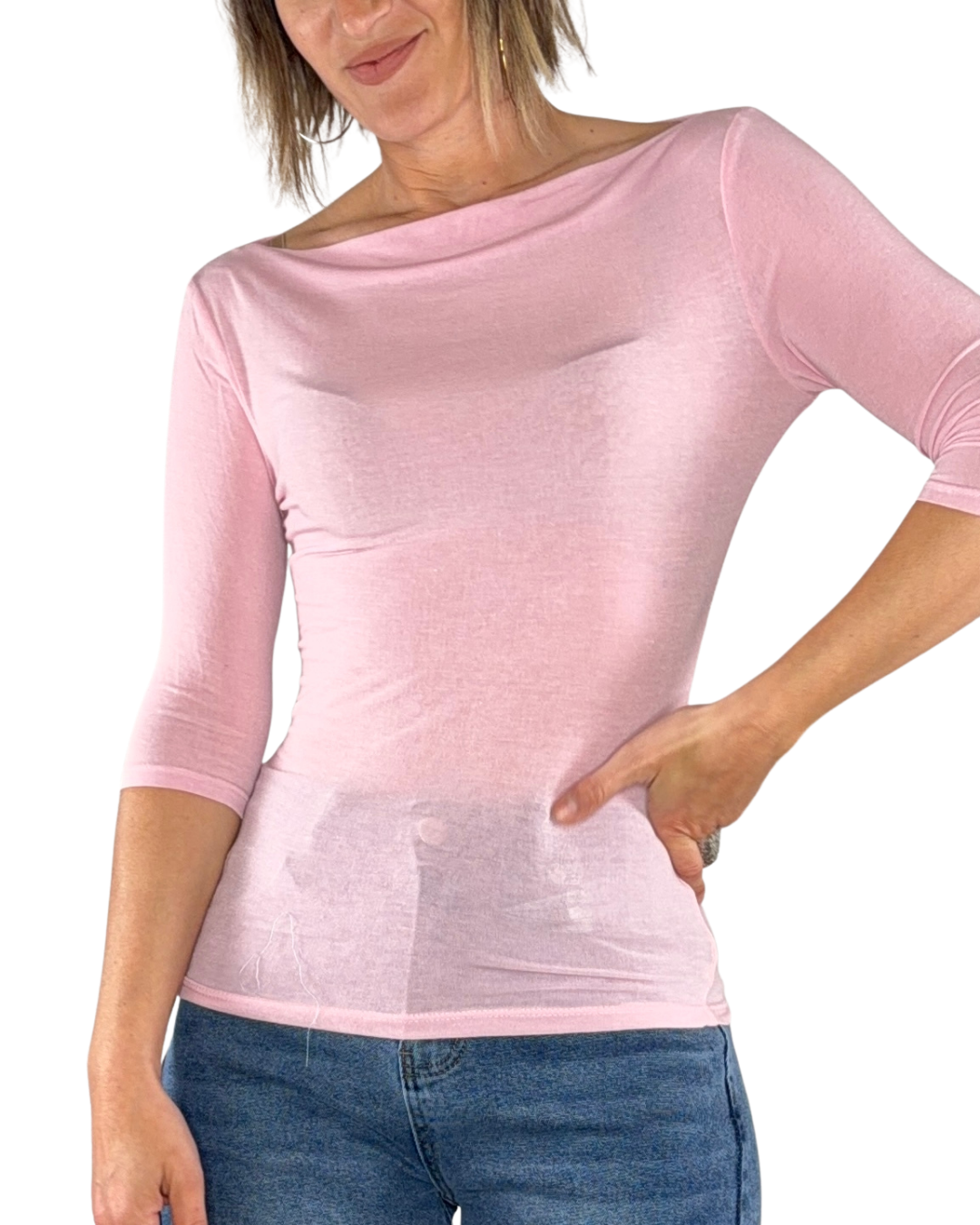 T-shirt manica a 3/4 con scollo a barchetta in misto seta, il capo che farà da seconda pelle nella mezza stagione, il pezzo basic che non può mai mancare.