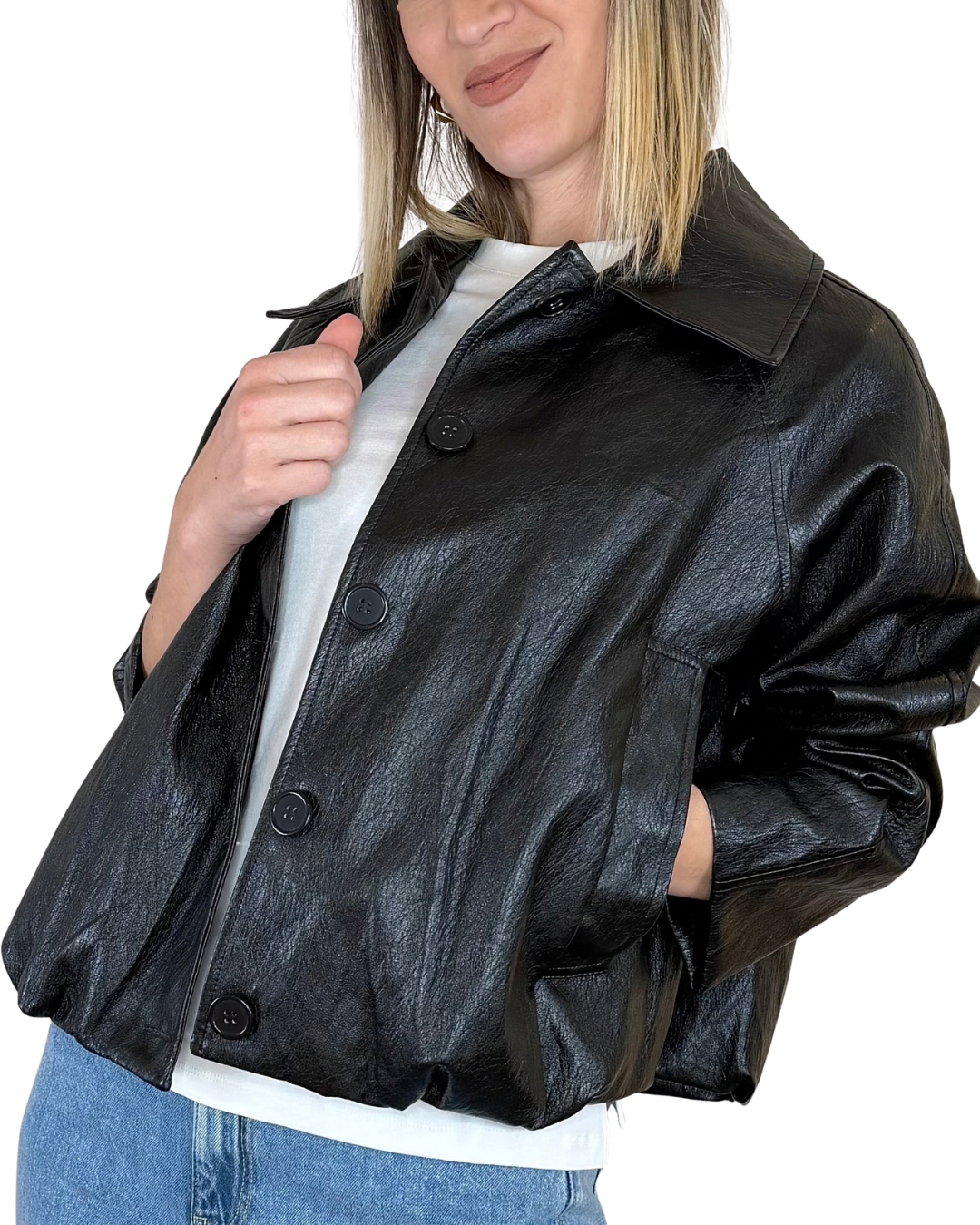 Giubbino in morbidissima ecopelle effetto rimborsato con colletto, tasche, e chiusura a bottoni